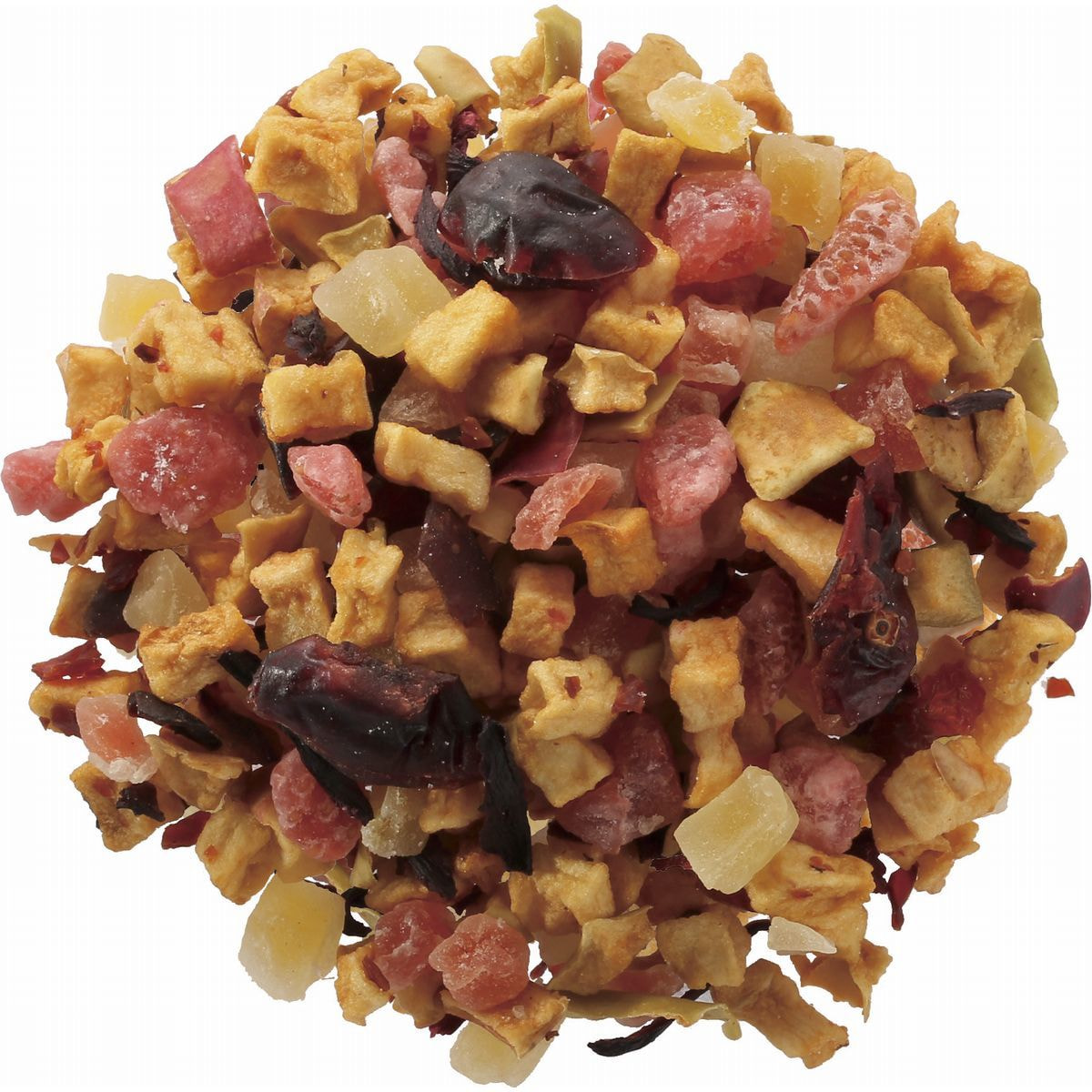 加糖ドライストロベリー(タイ製造)、有機ドライアップル、加糖ドライクランベリー、加糖ドライパパイヤ、加糖ドライマンゴー、有機ハイビスカス/香料、クエン酸、保存料(亜硫酸塩)、着色料(赤40)